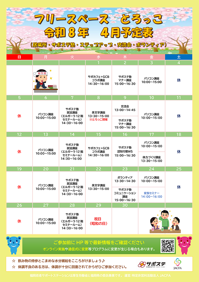 - 4月フリースペースの予定表更新